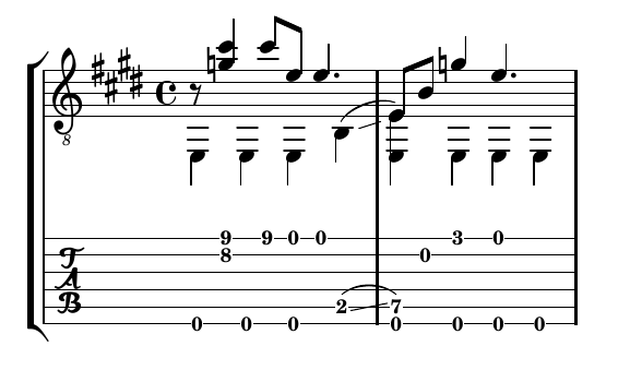Ich dachte ich könnte die Sache in den Griff kriegen, indem ich für die Melodie und die Bassbegleitung getrennte Stimmen verwende, aber das geht auch nicht. In der Bassstimme kriege ich das nicht hin, weil sich da die beiden E überschneiden und in der Melodie geht das auch nicht wegen dem punktiertem e aus Saite 1.