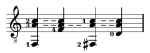 Im zweiten Teil (Takt 14) erscheint der "vorgezogene" A Akkord als Teilbarré und der Komponist/Autor wünscht hierfür auch den Finger 1. Andererseits beschreibt der Autor auch immer wieder, wie wichtig es ist, die Fingerbewegungen zu optimieren. Dabei habe ich jetzt festgestellt, das es einfacher ist, nach dem dritten Achtelschlag einfach den Finger 2 (auf Saitre 4) herunterzuklappen um auch die Saite 3 zu erwischen. Kann man in Lilypond bei Griffdiagrammen angeben, das ein (Teil-) Barré mit einem bestimmten Finger (hier 2) gegriffen werden soll?
